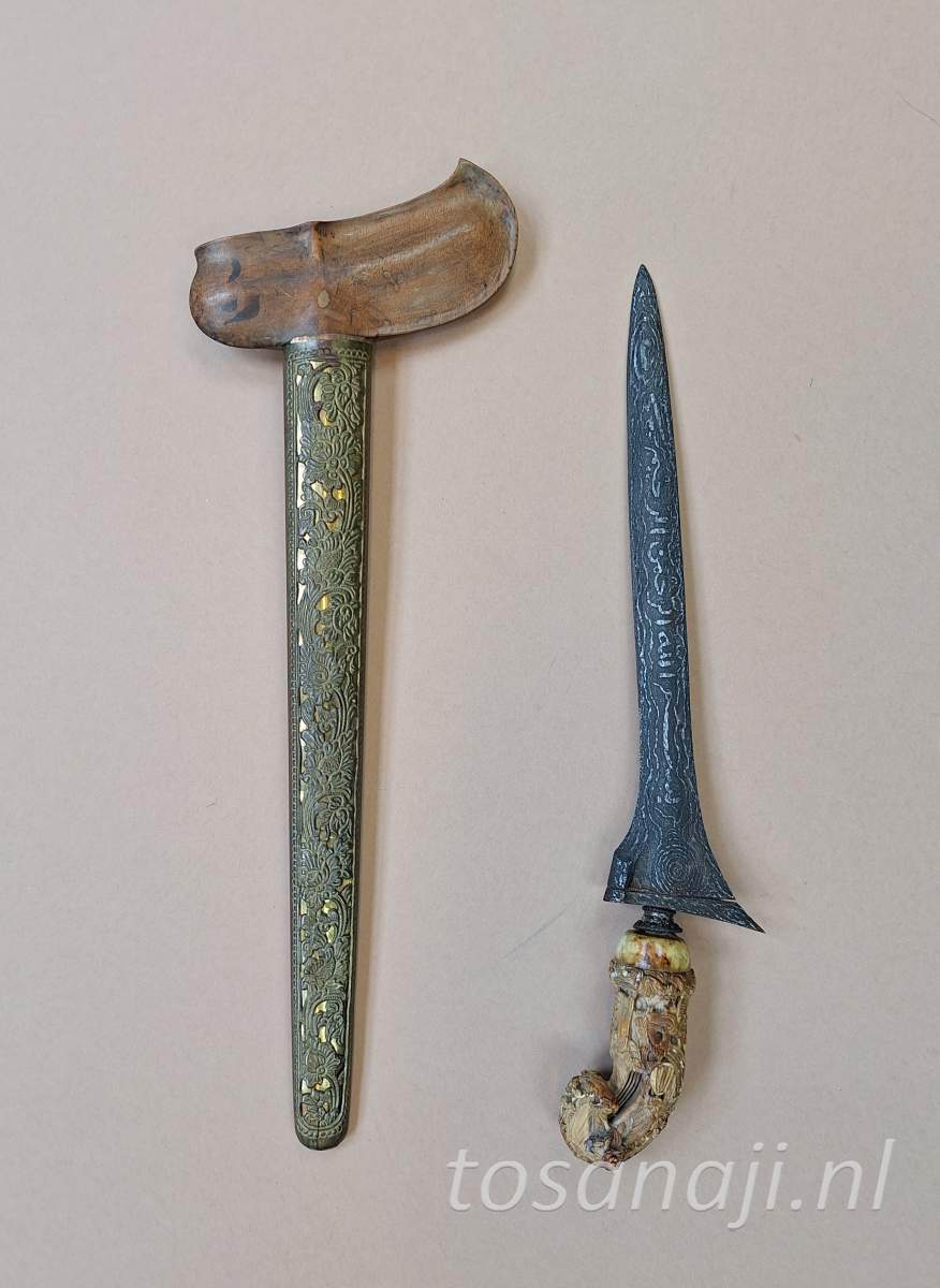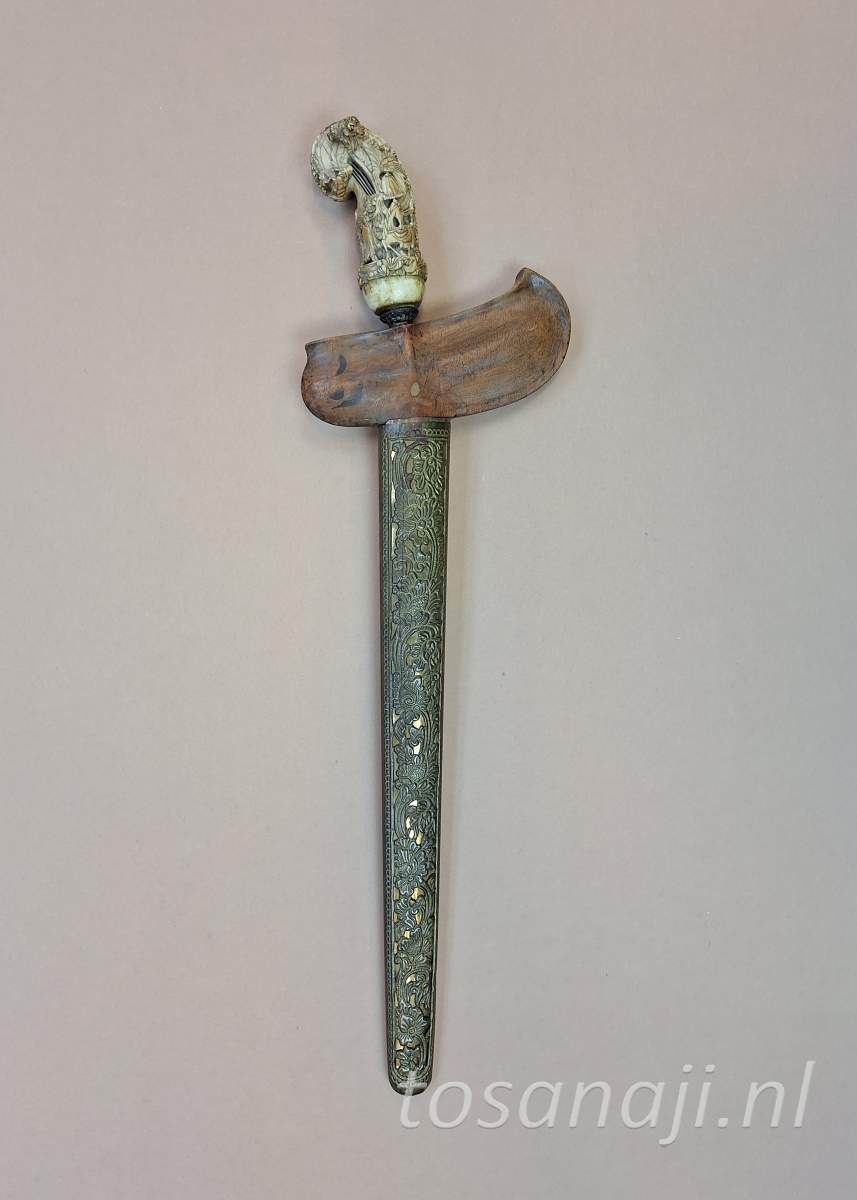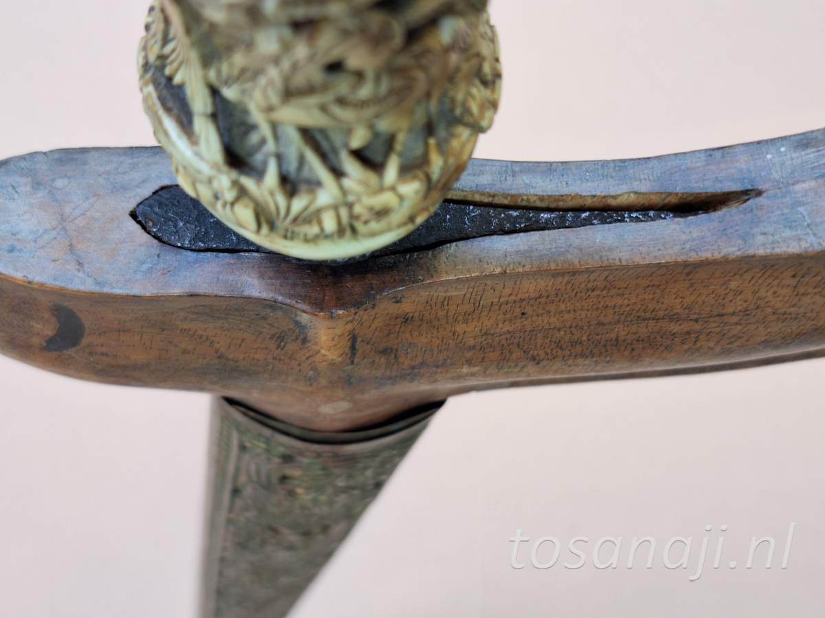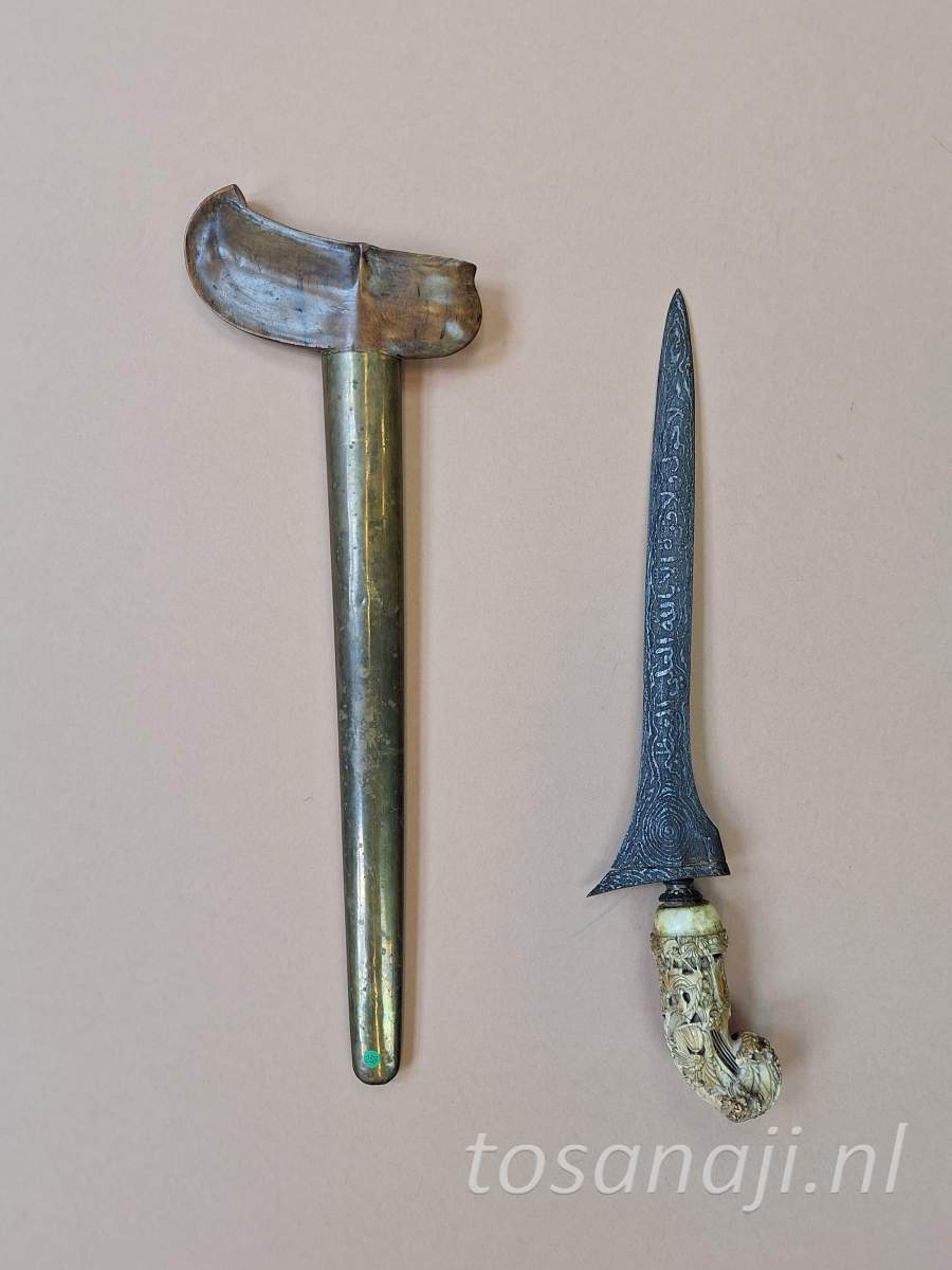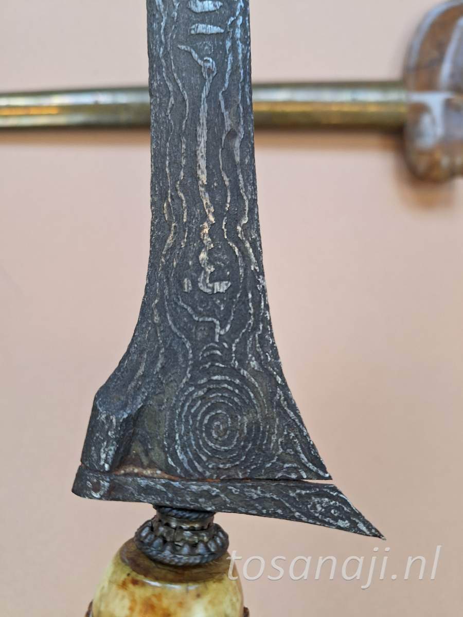 K288 Antieke keris van Madura. Een TOP greep type DONORIKO van olifanten ivoor. Een rechte pamorkling met dapur BROJOL, waarschijnlijk tangguh Madura begin 19e eeuw. Een kling waarin een Kul Buntet en ook Koran verzen zijn geëtst.