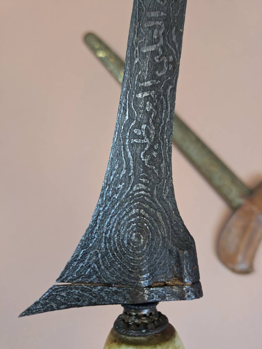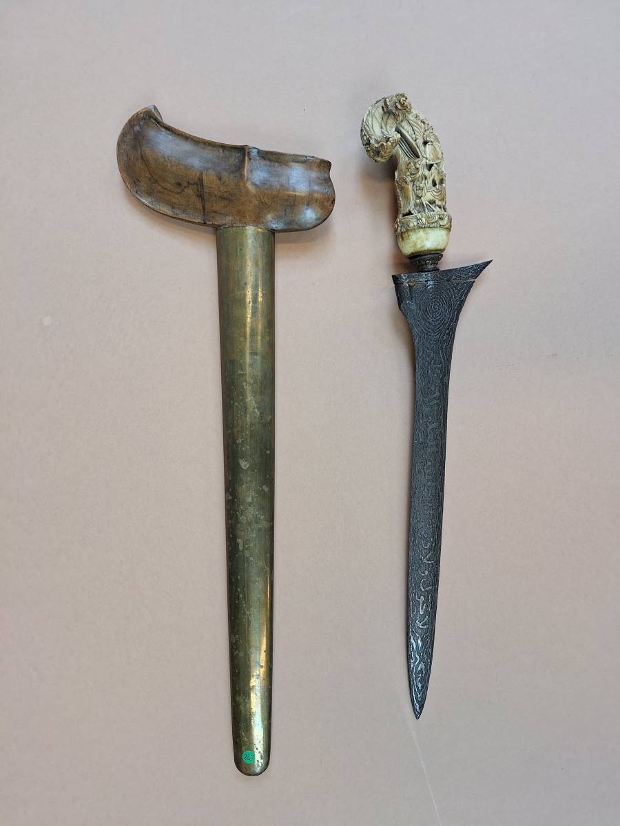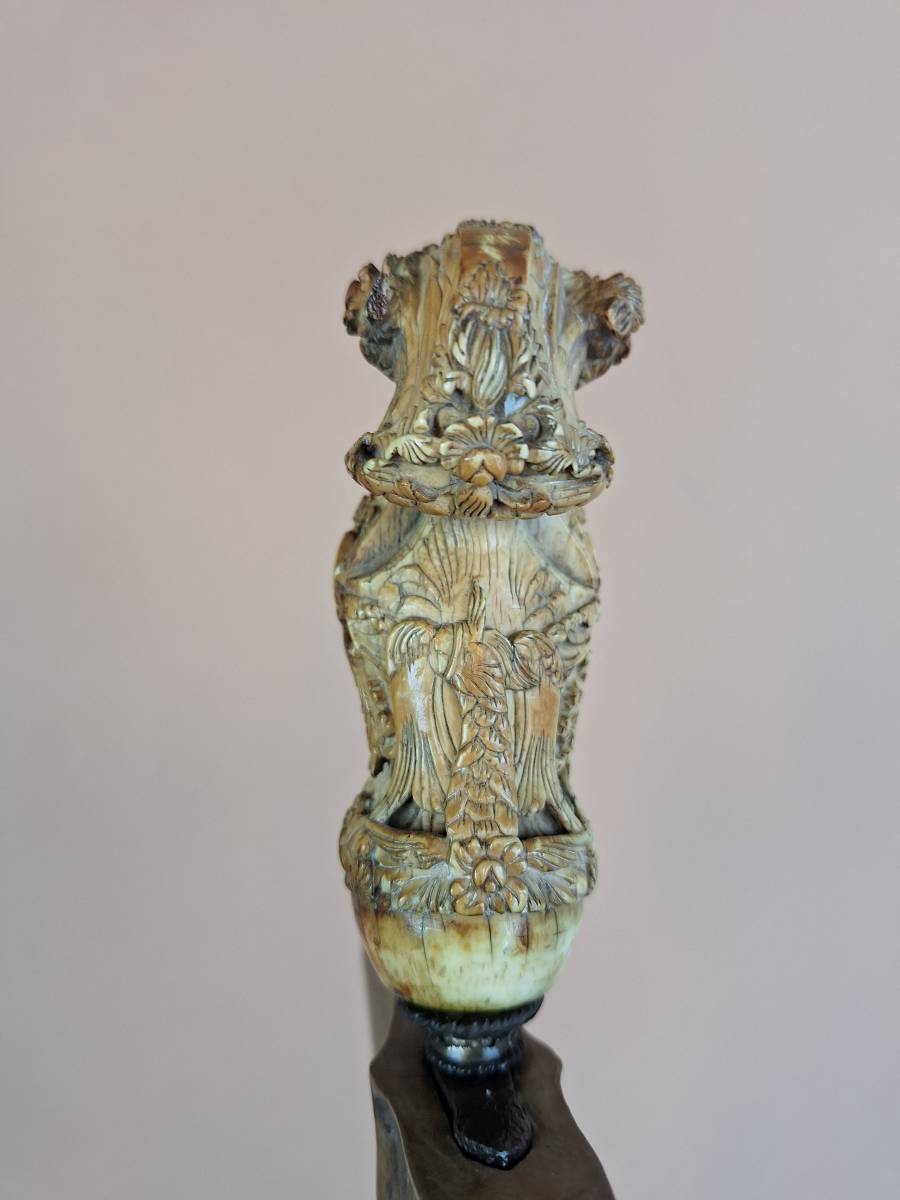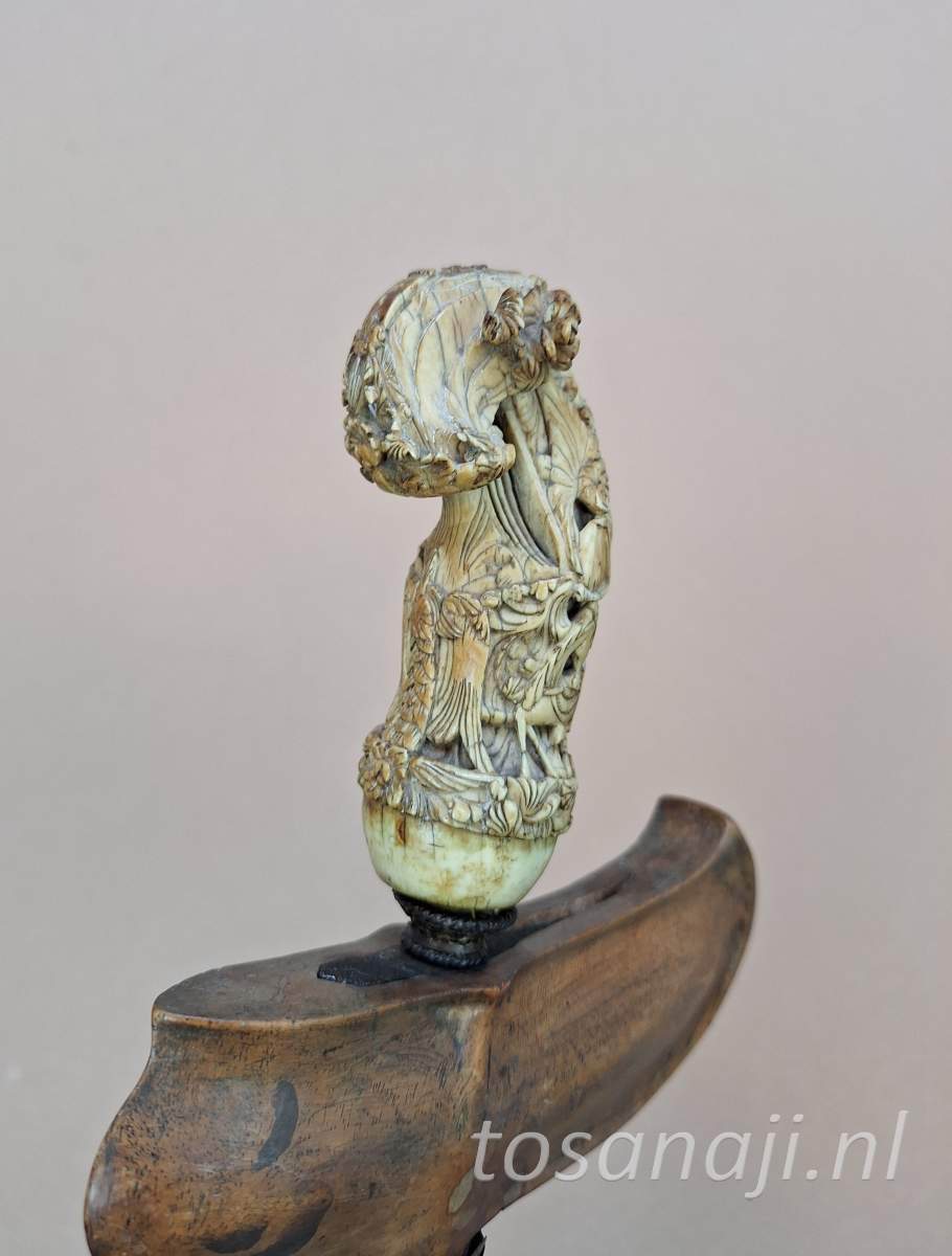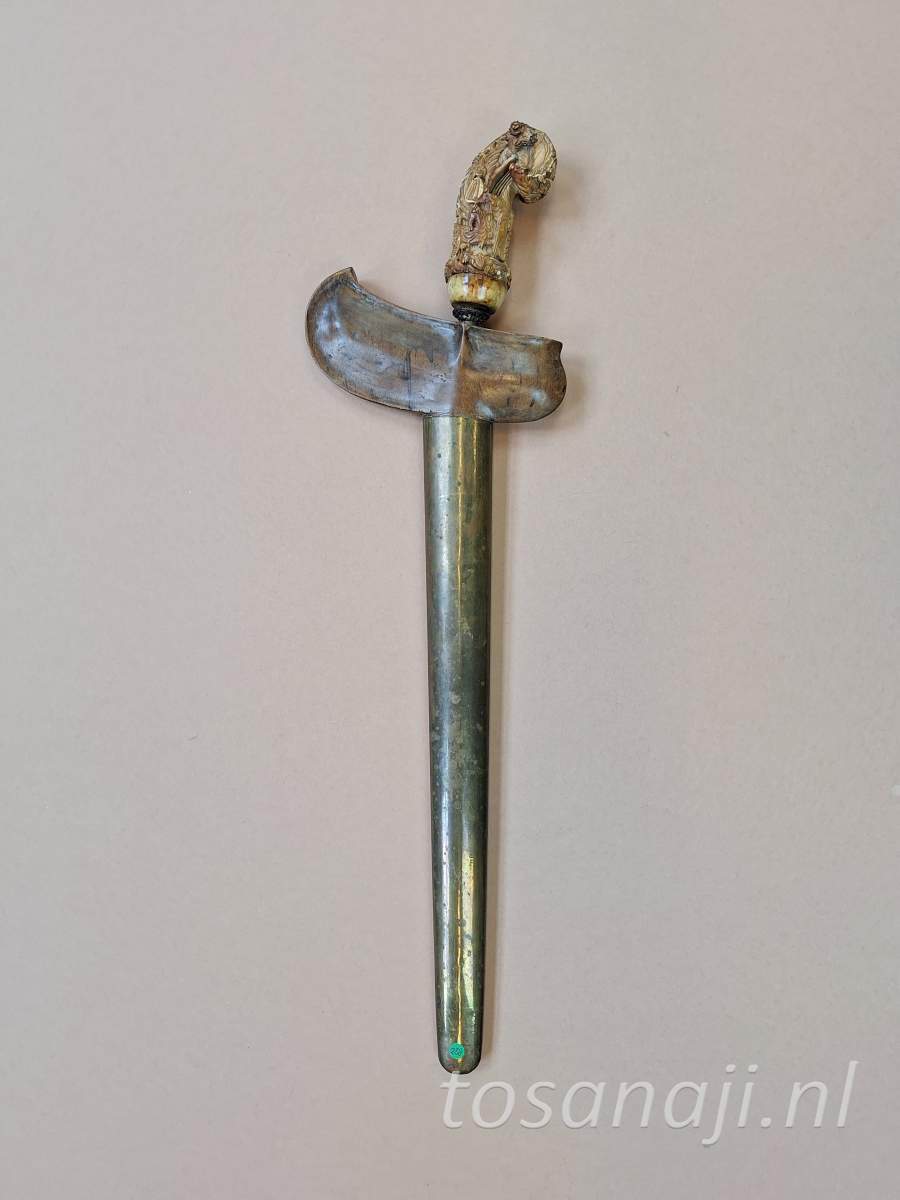 K288 Antieke keris van Madura. Een TOP greep type DONORIKO van olifanten ivoor. Een rechte pamorkling met dapur BROJOL, waarschijnlijk tangguh Madura begin 19e eeuw. Een kling waarin een Kul Buntet en ook Koran verzen zijn geëtst.