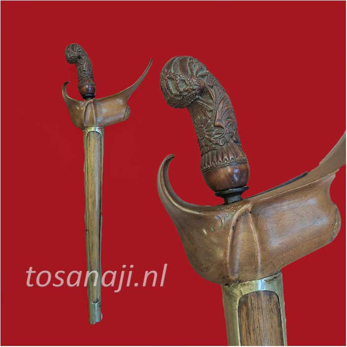 De greep is fijn bewerkt met heraldische tekens, o.a. epauletten en een zon op voor- en achterzijde gesneden. Een mooie greep met patina.