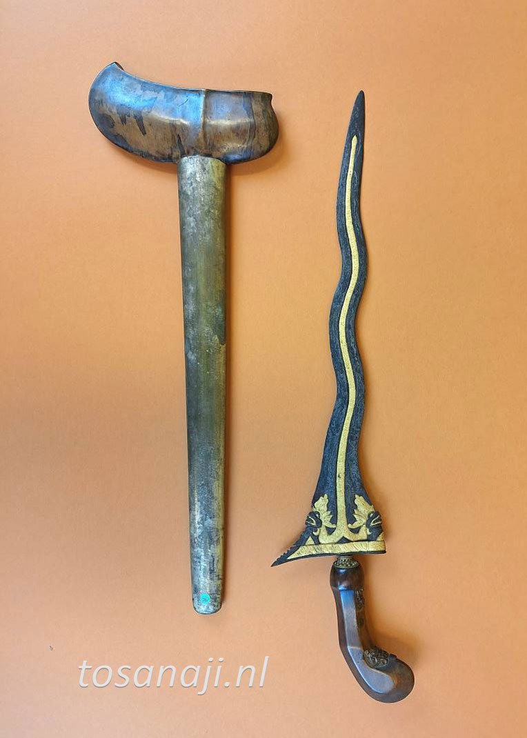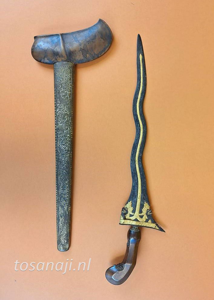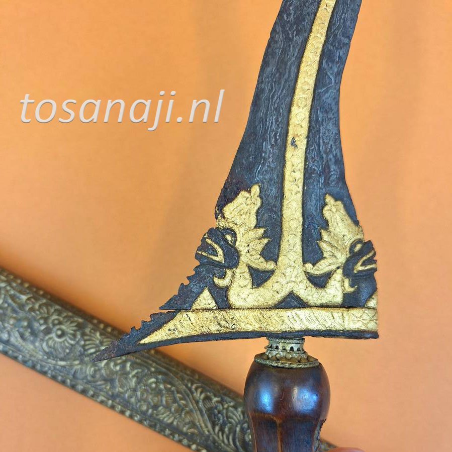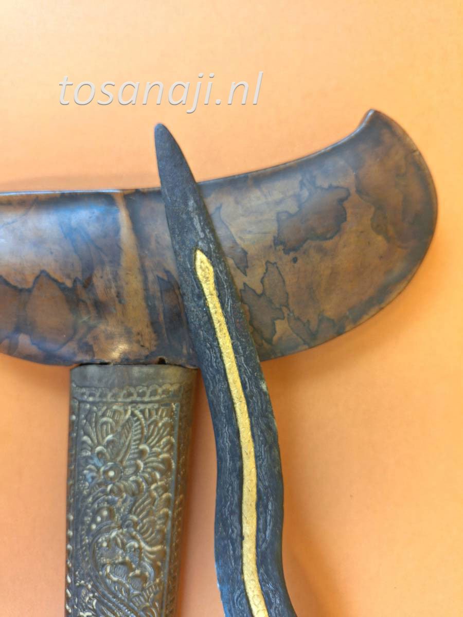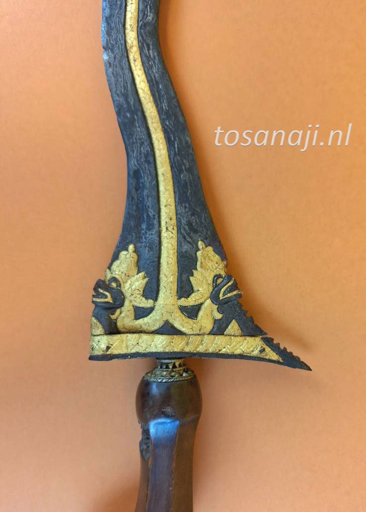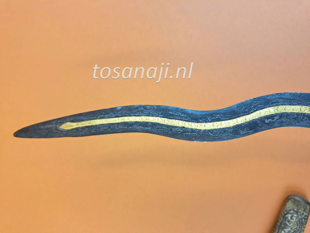 K263 Originele antieke keris uit de Mataram, waarschijnlijk de Kartasura periode( 18e eeuw). Een geslangelde pamorkling met 5 luk en vergulde versieringen en afbeeldingen van de mannelijke en vrouwelijke Naga.