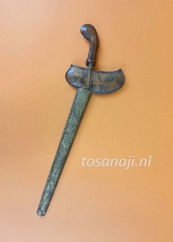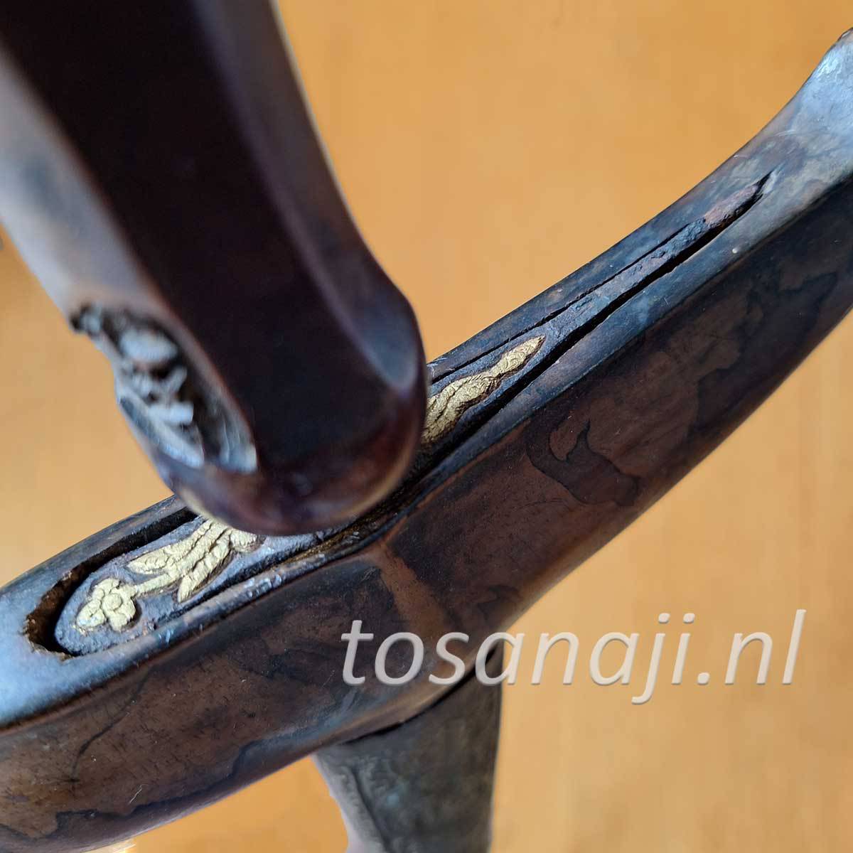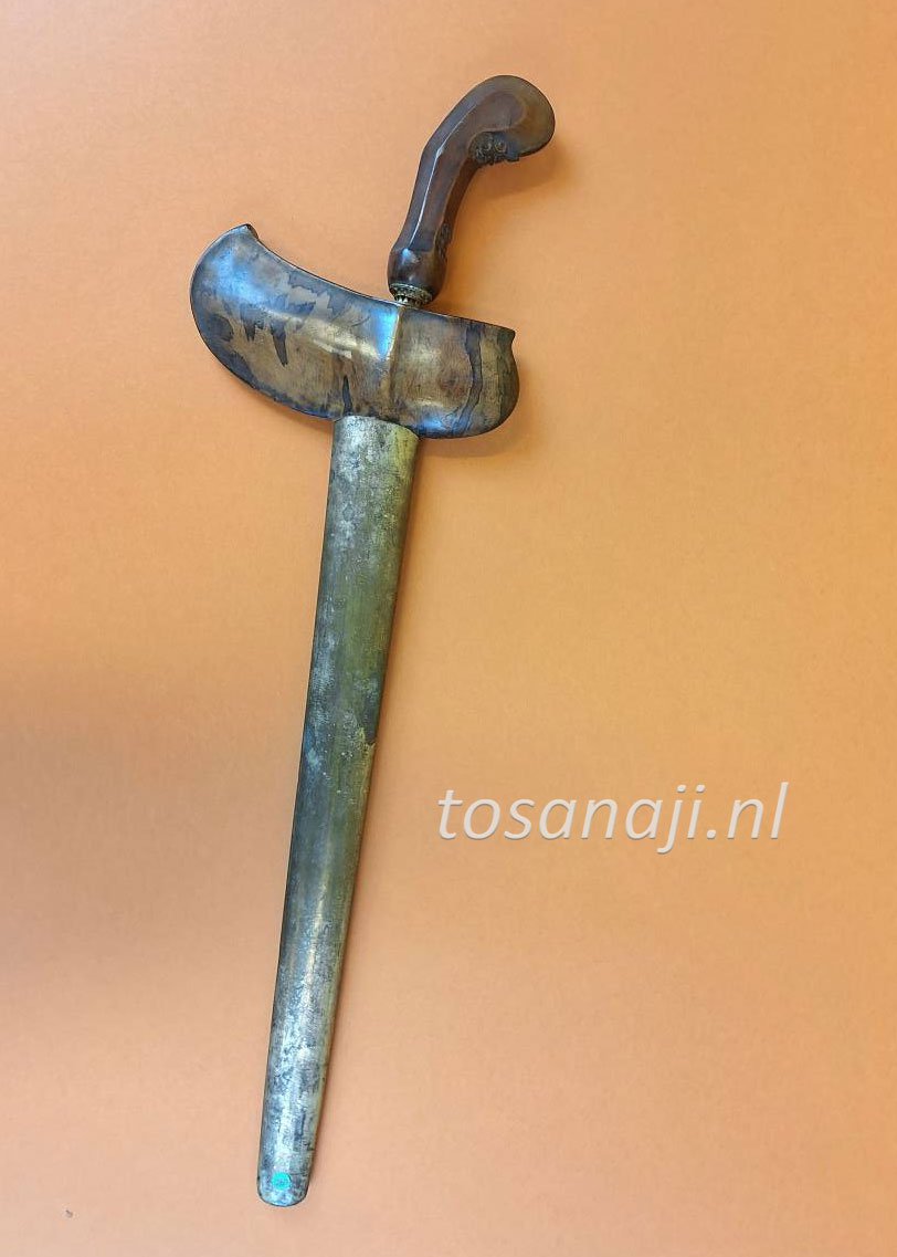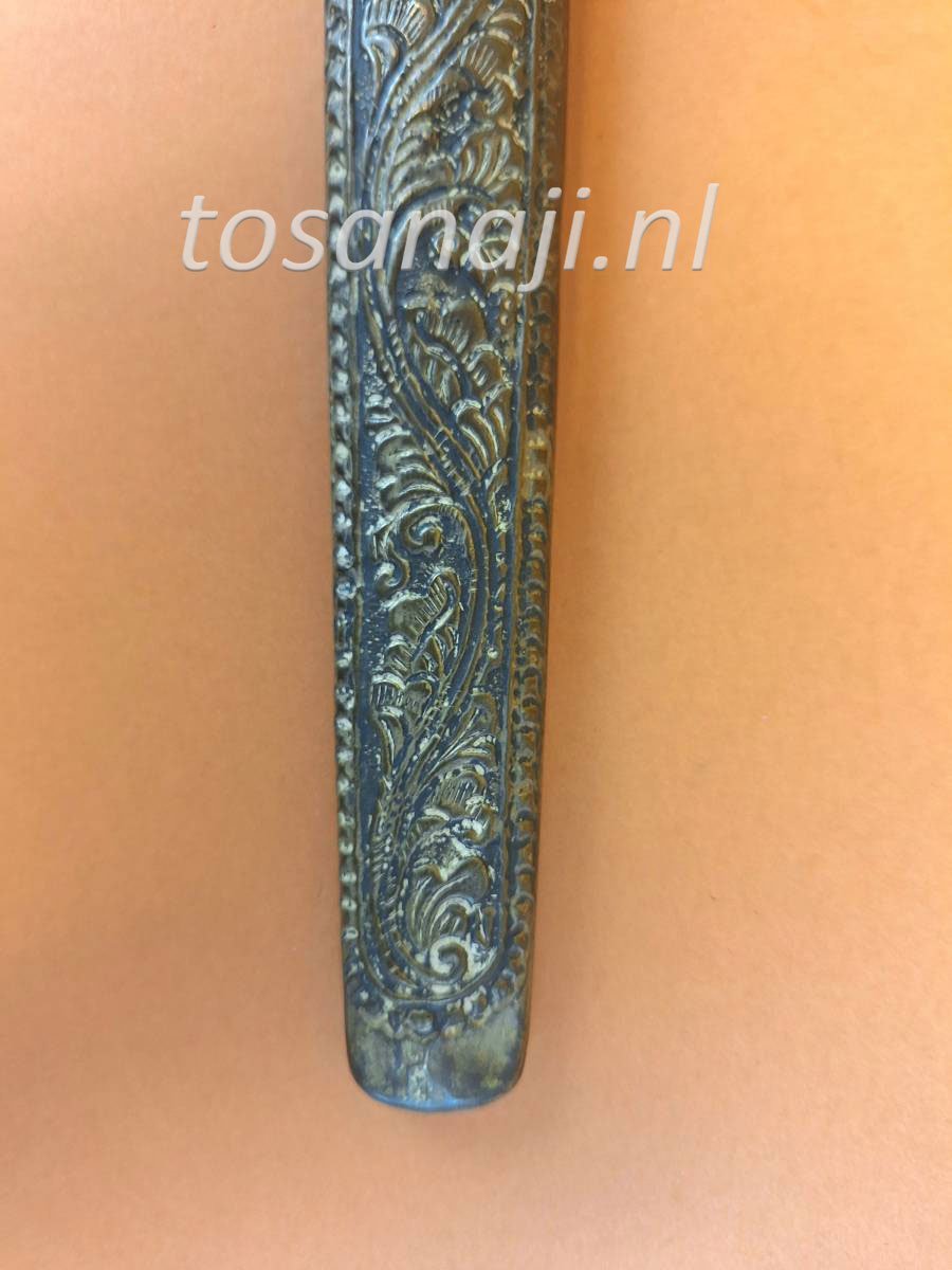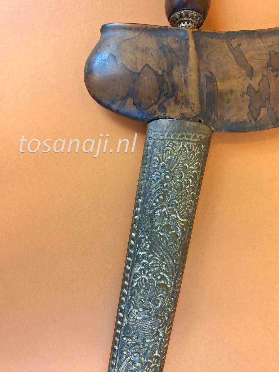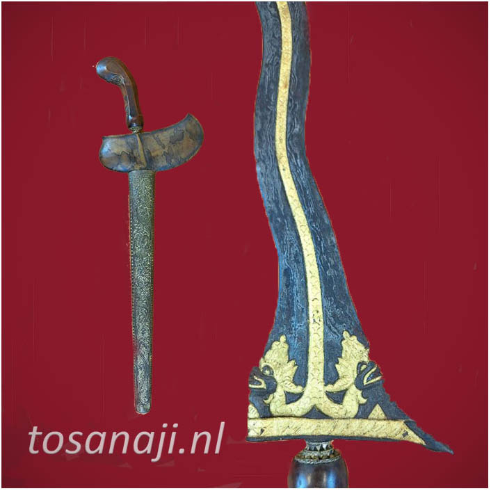 K263 Originele antieke keris uit de Mataram, waarschijnlijk de Kartasura periode( 18e eeuw). Een geslangelde pamorkling met 5 luk en vergulde versieringen en afbeeldingen van de mannelijke en vrouwelijke Naga.