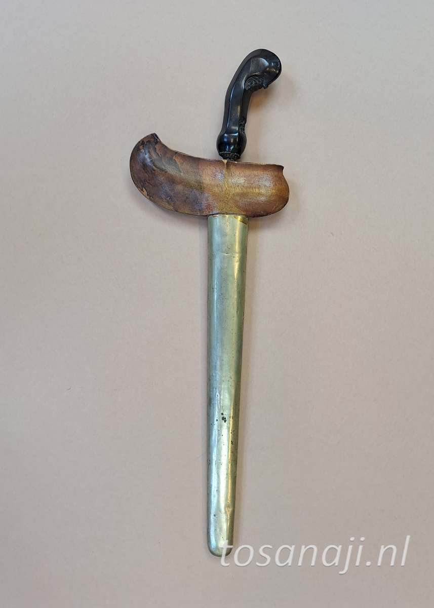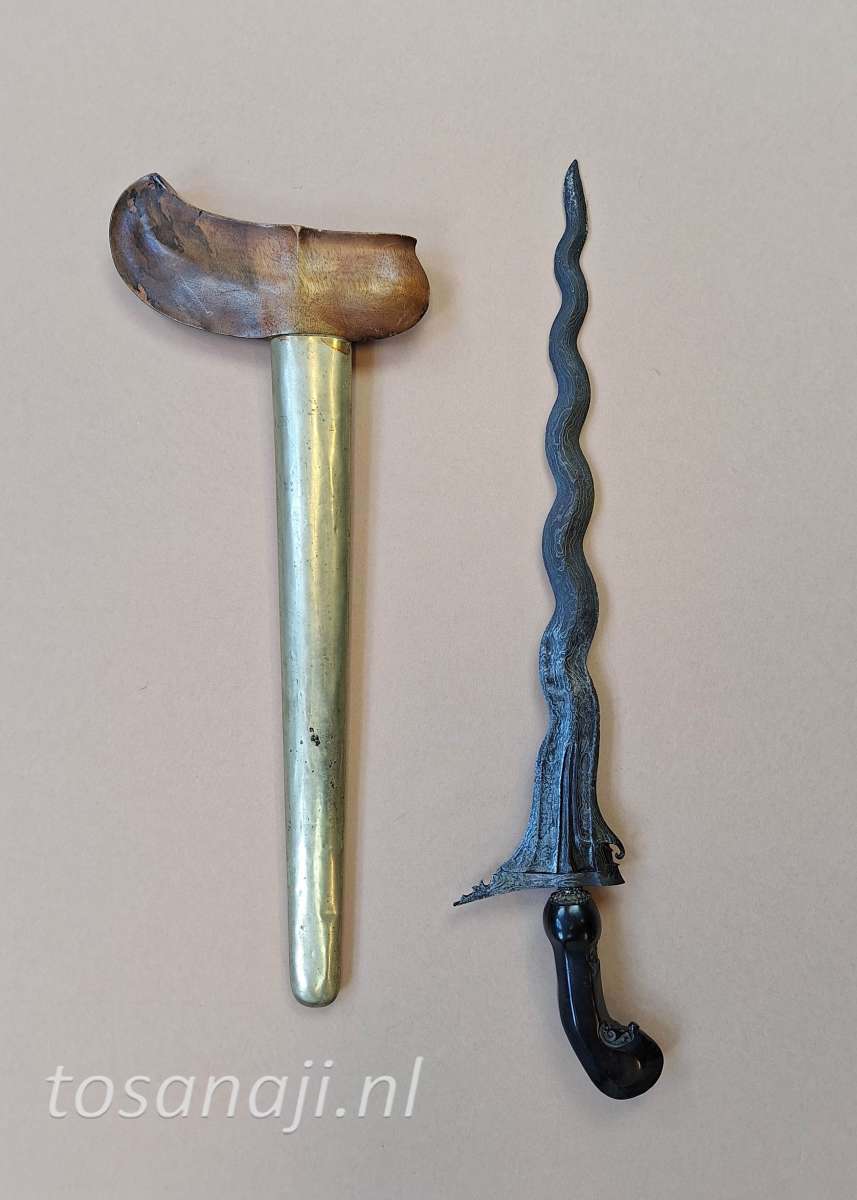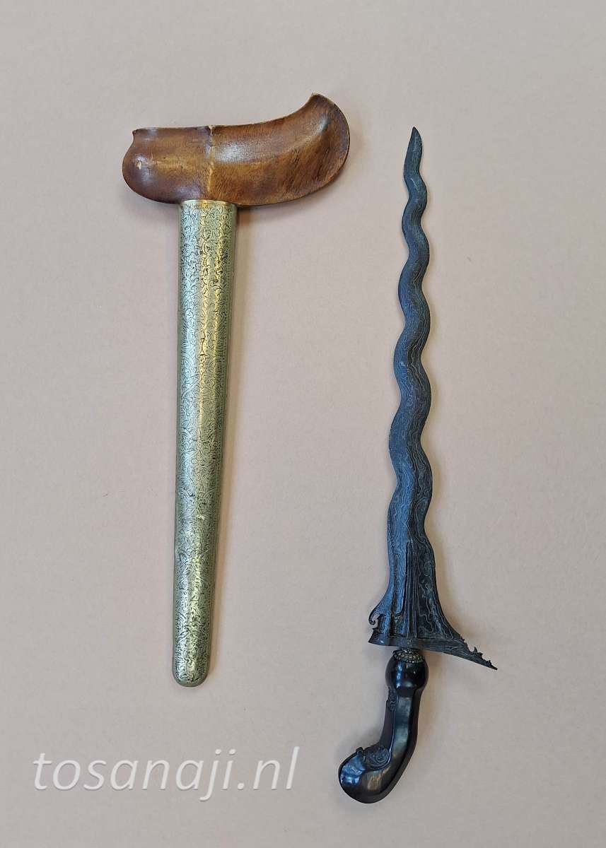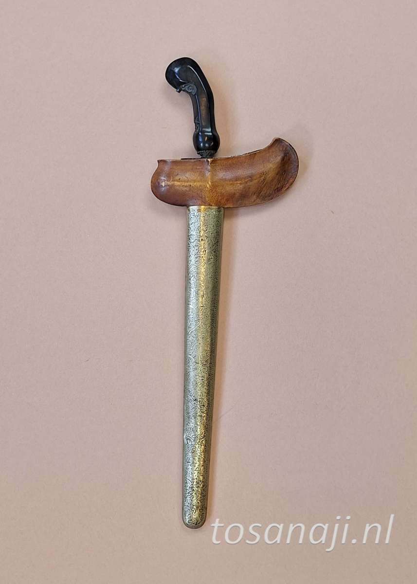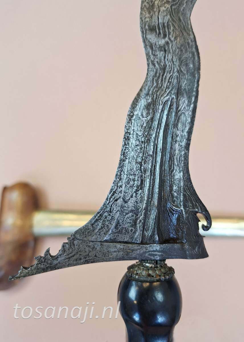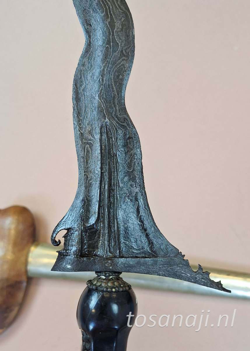K289 Een antieke keris van Surakarta. De wrangka( schip) van de schede type GAYAMAN gesneden uit kayu pelet en een greep van kayu ARENG (ebbenhout). De pendok type BUNTON is gestoken met florale morieven. Een wilah (kling) met 13 luk, dapur SENGKELAT met pamor NGULIT SEMANKA, waarschijnlijk uit de 19e eeuw.