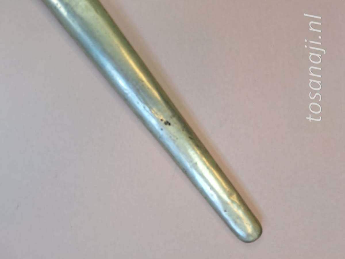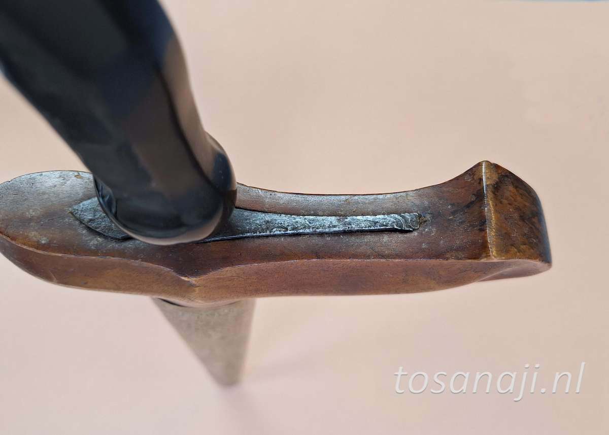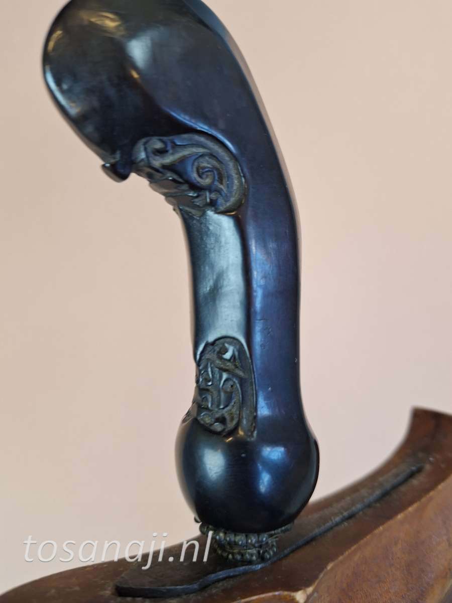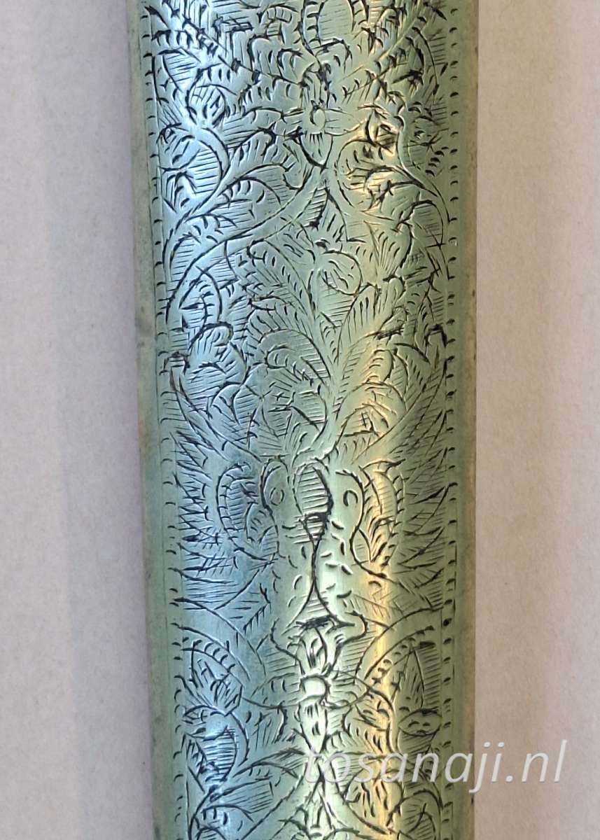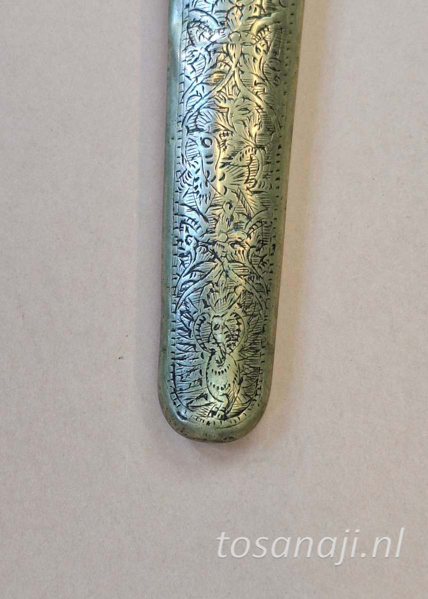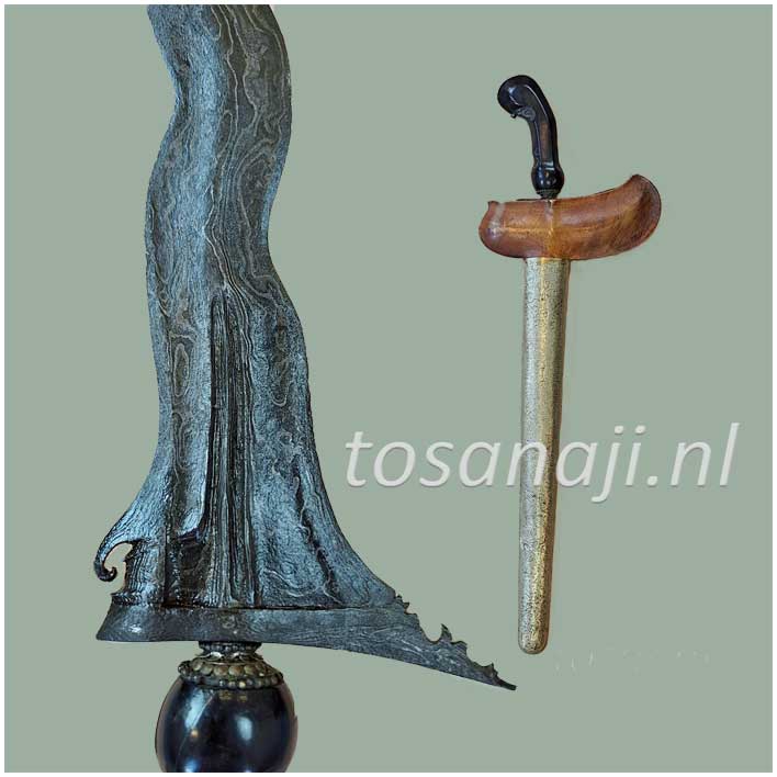 K289 Een antieke keris van Surakarta. De wrangka( schip) van de schede type GAYAMAN gesneden uit kayu pelet en een greep van kayu ARENG (ebbenhout). De pendok type BUNTON is gestoken met florale morieven. Een wilah (kling) met 13 luk, dapur SENGKELAT met pamor NGULIT SEMANKA, waarschijnlijk uit de 19e eeuw.