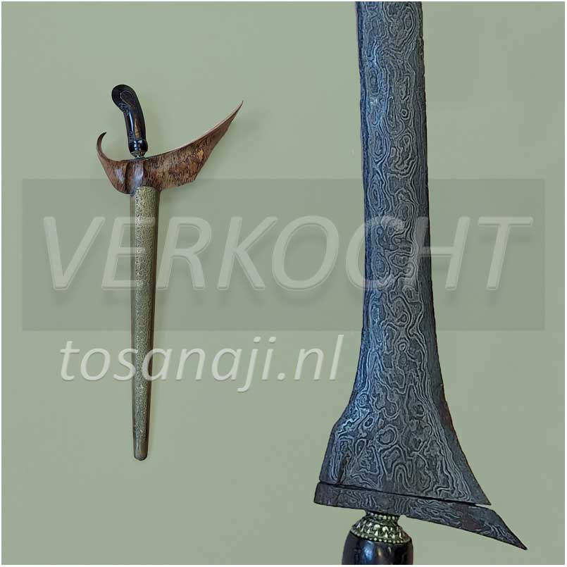 K295 keris met een hele fraaie aankleding in de stijl van Jogjakarta. De wrangka type BRANGGAH PAKUBUANAN ?( schip van de schede) is gesneden uit Kayu pelet SEMBUR / UDAN RIRIS met een pendok BUNTON. Een rechte kling met dapur BROJOL en pamor BERAS WUTAH, een algemeen pamor dat voor een ieder geschikt is. Beetje roest op de ganja.