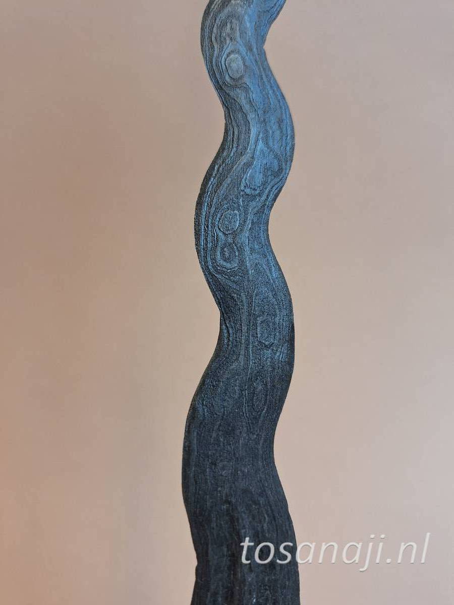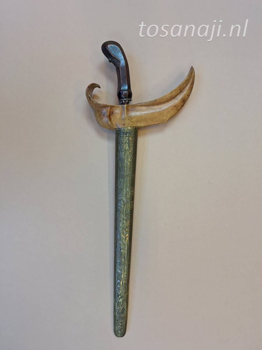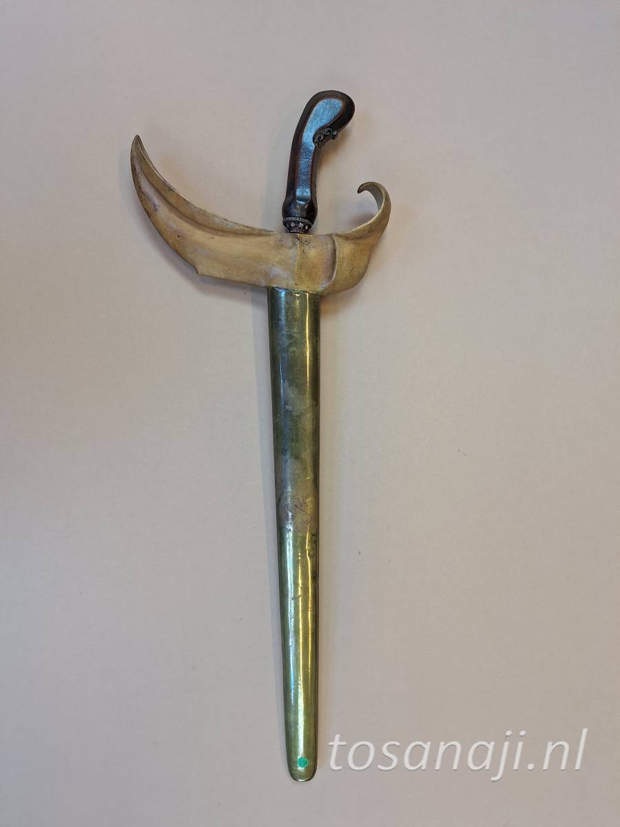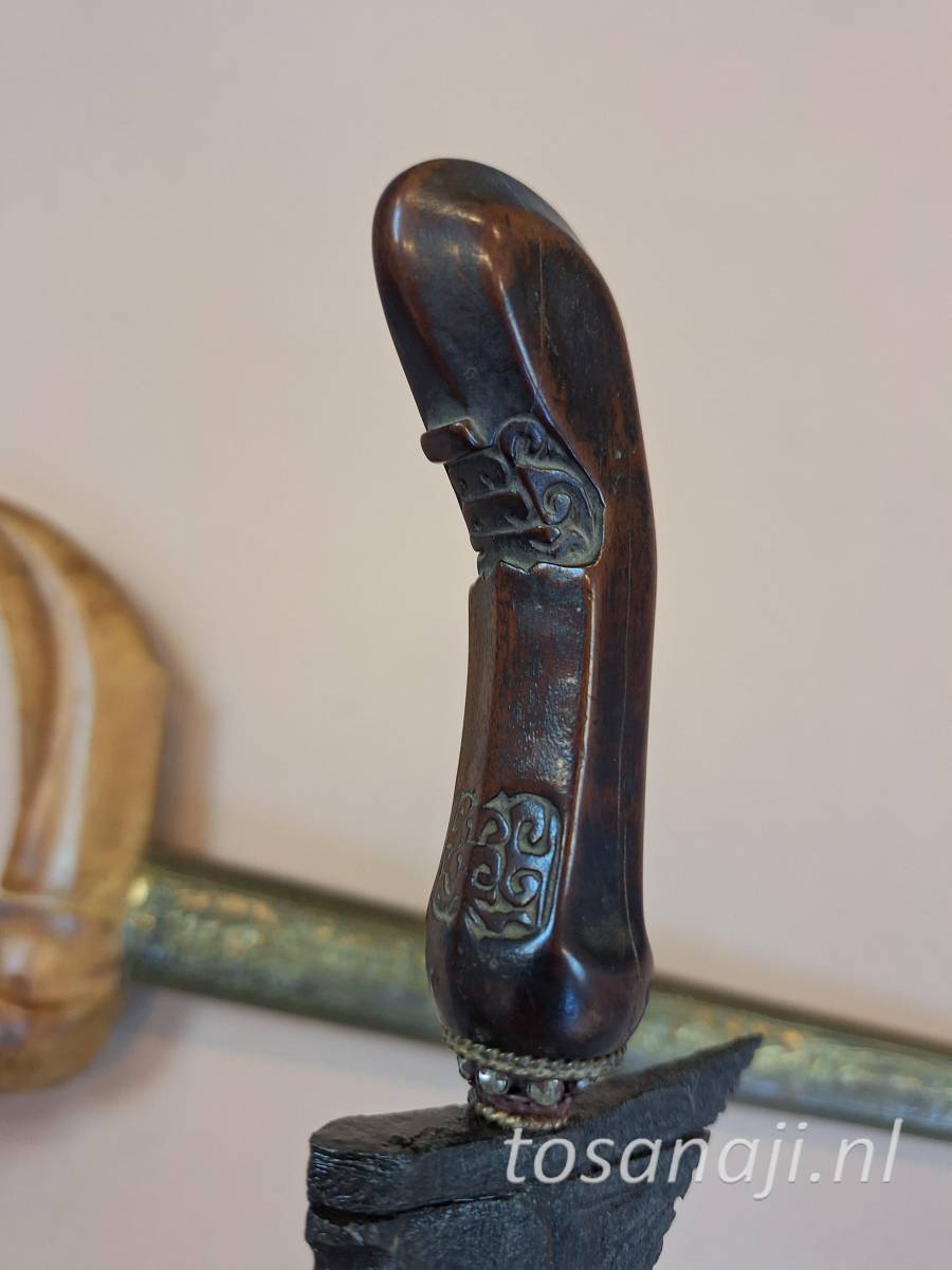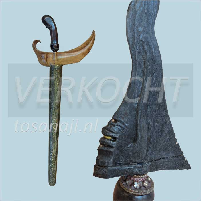 K131 Antieke keris met een aankleding van Solo. De wrangka (schip) van de schede is gesneden uit KEMUNING hout en de pendok is van het type BUNTON met florale motieven. Een rechte pamorkling met dapur NAGA SULIMAN 11 luk, waarschijnlijk uit de 16e-17e eeuw, tangguh Madiun-Mataram. De kling is gesmeed met het pamor SISIK NAGA( slangenhuid) en/of WAHYU TUMERUN ( overdracht van inspiratie). Er is wat ruimte tussen de kling en de schedemond.