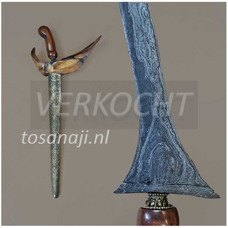 K271 Antieke keris met een aankleding van Jogjakarta. Een schede met een wrangka BRANGGAH van kayu pelet met een pendok BUNTON. Een rechte pamorkling met dapur SEPANG wellicht uit de 17e/18e eeuw. Aan de voorzijde van de kling op de basis pamor PUTRI KINURUNG? En aan de achterzijde pamor KUMBAR URIP?