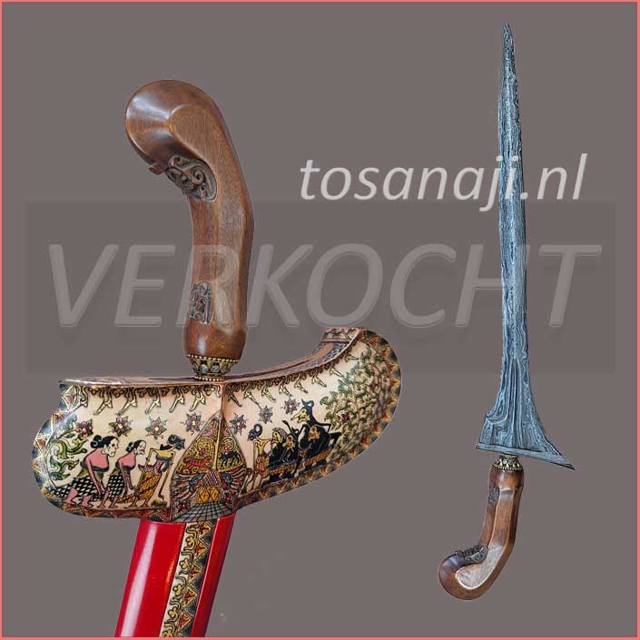 K303 keris met een aankleding uit Surakarta( Solo). De schede is zeer fijn beschilderd met wajangfiguren. Zeer hoge kwaliteit en gave staat. Mooie greep met een vergulde mendak met steentjes. Greep zit stevig op de kling ( gelijmd?) Een lichte slijtage op de randen van de wrangka waaruit afgeleid kan worden dat deze keris ook echt gedragen is. Pendok is rood van het type Kemalo , mogelijk nieuw. In oude tijden werden krissen met rode pendoks gedragen door directe familie van de Susuhunan( vorst). De pamorkling heeft waarschijnlijk tangguh Mataram, periode 17e eeuw? Het pamor is overwegend Ngulit Semanka, maar er zijn er meer.