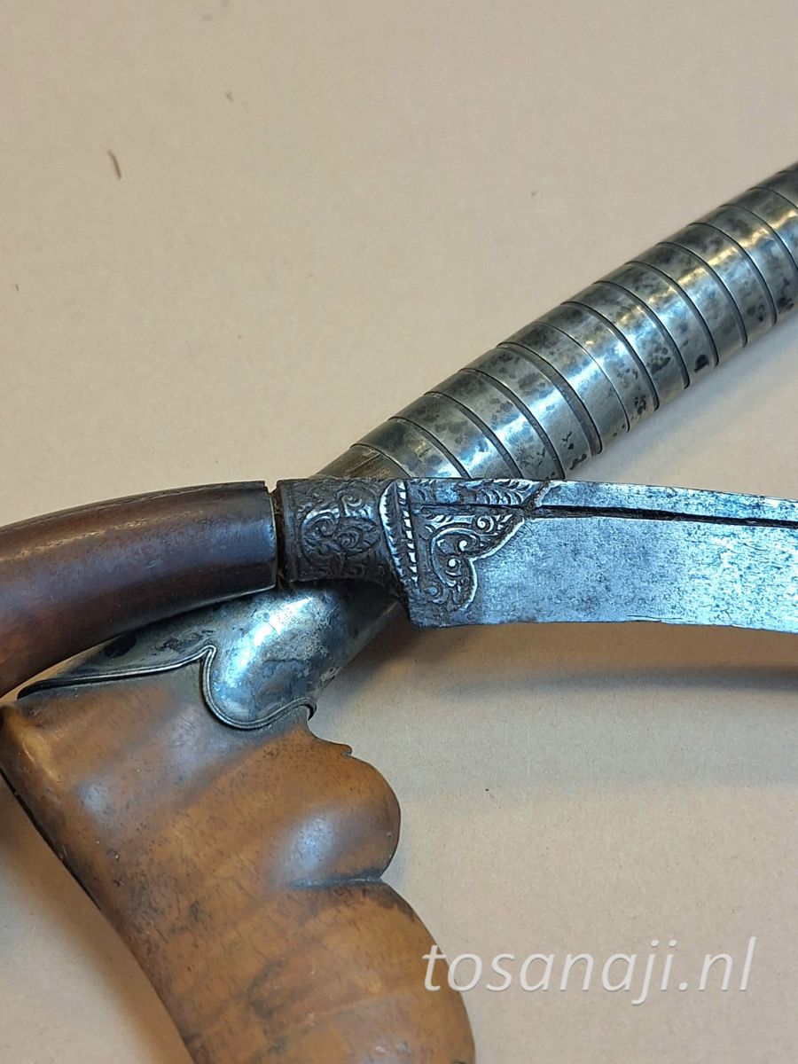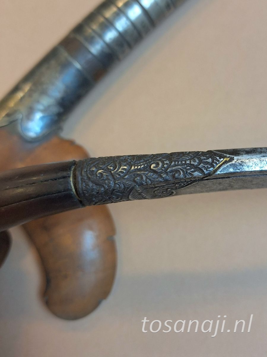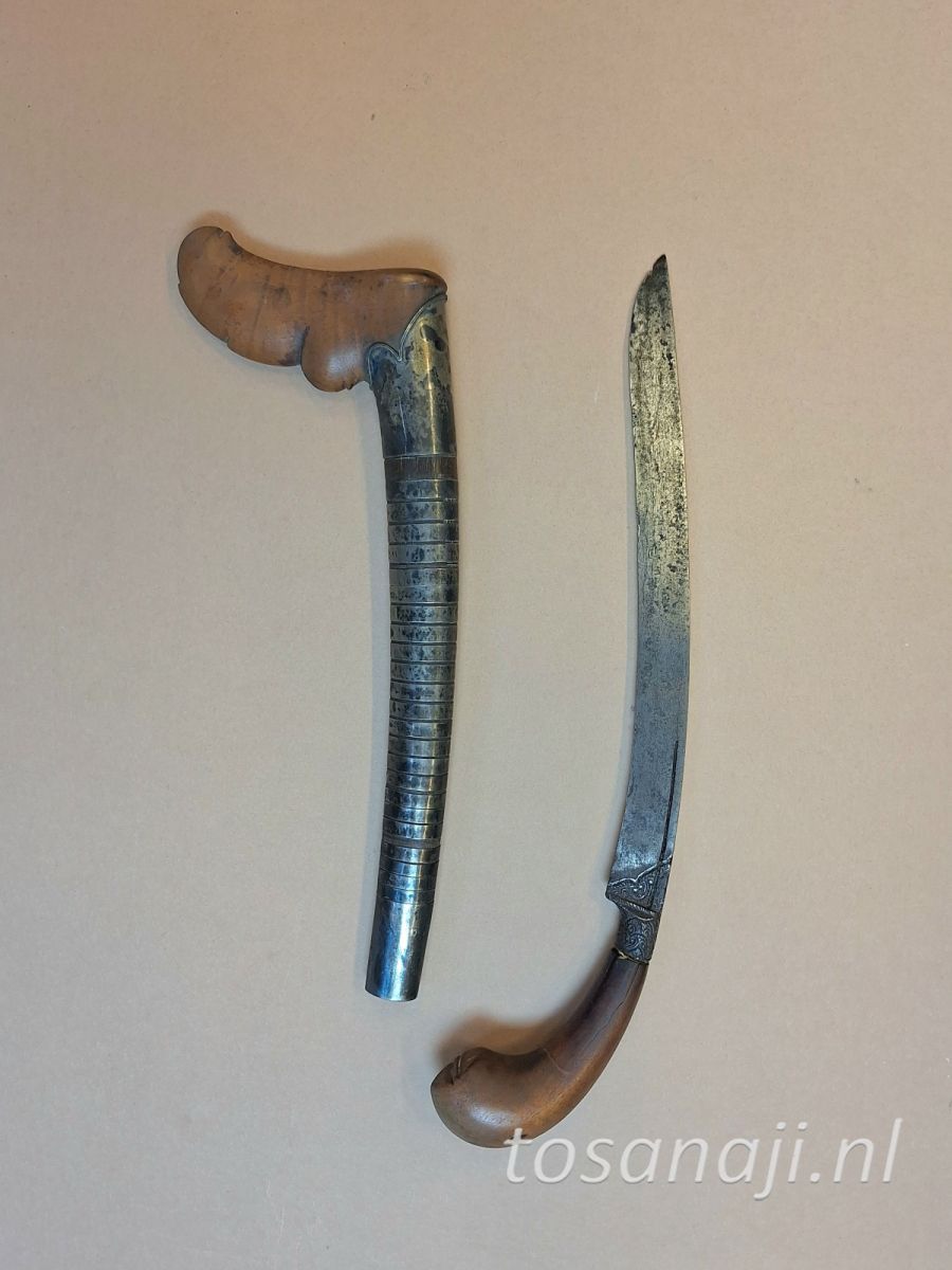 K309 Sewar van Sumatra. Versiering aan de basis van het blad aangebracht met kleine sporen van vergulding. De schede is omwonden met zilveren banden.