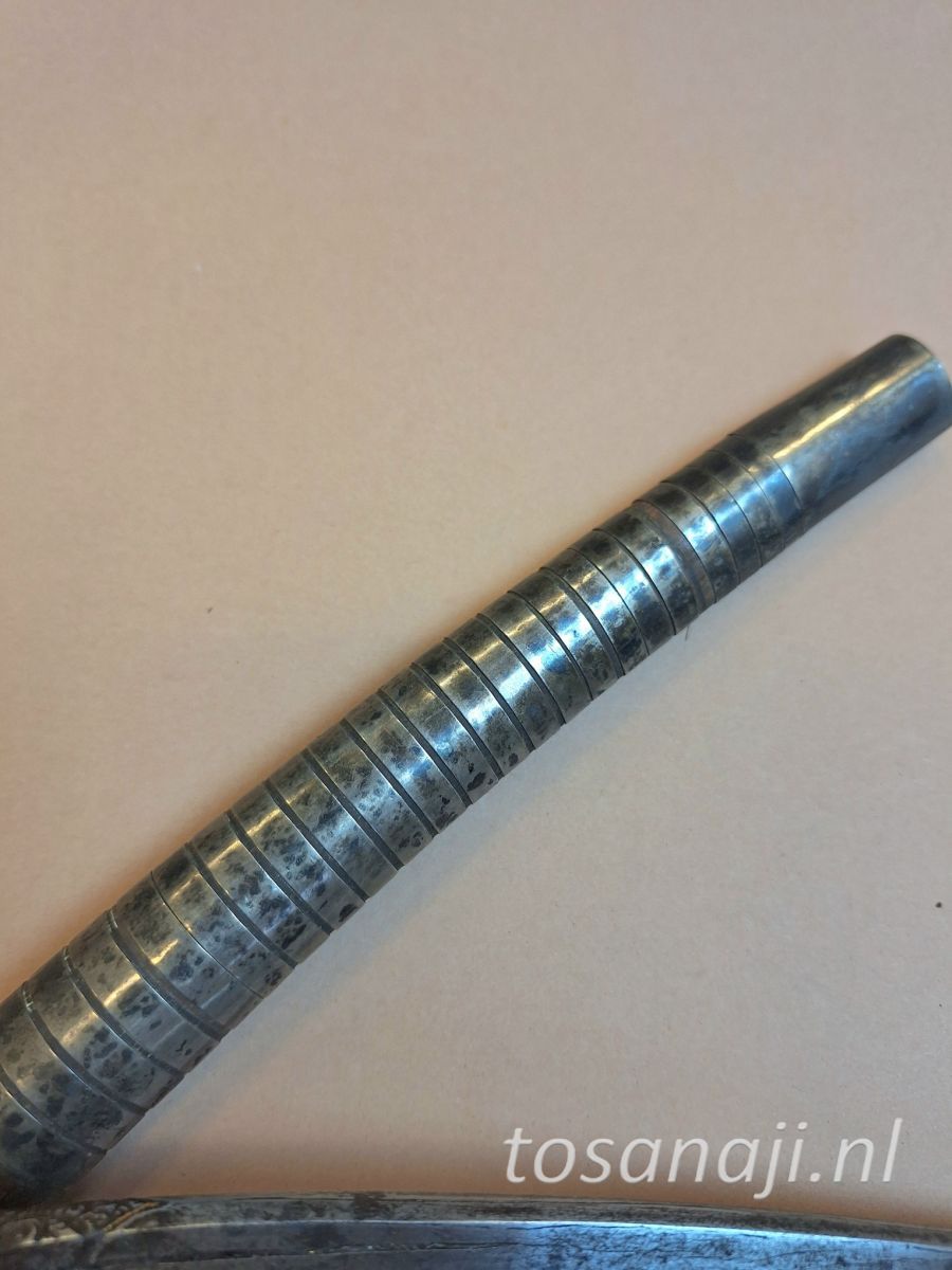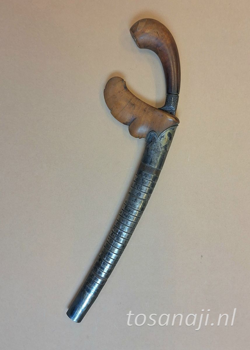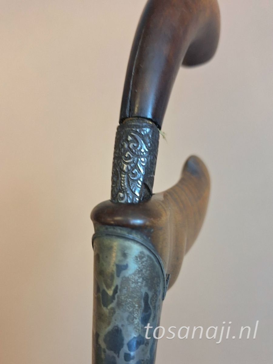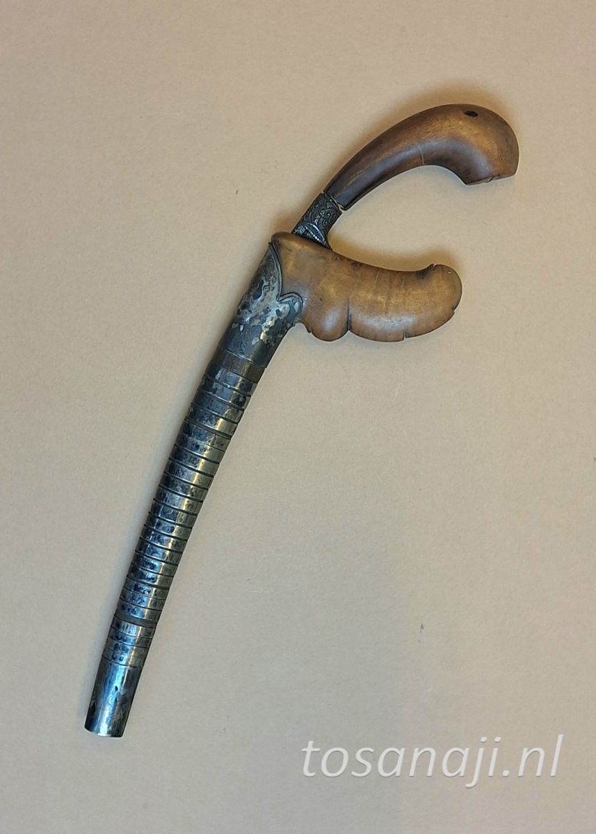 K309 Sewar van Sumatra. Versiering aan de basis van het blad aangebracht met kleine sporen van vergulding. De schede is omwonden met zilveren banden.